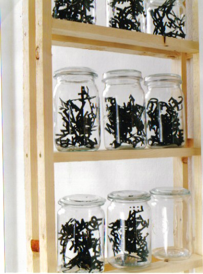 Die Bildhauerin Renate Wiedemann gibt den Buchstaben und den aus diesen gebildeten Worten und Sätzen einen Körper und macht sie damit angreifbar. Wenn aber ein Buchstabe einen Körper erhält, kann man alles mit ihm machen, was ein Körper zulässt. Man kann ihn anfassen und allseitig betrachten, hochwerfen, aufschichten, ankleben. Man kann ihn aufessen wie die Buchstaben in der Suppe. Also kann man ihn auch - so wie hier zu sehen - einmachen.